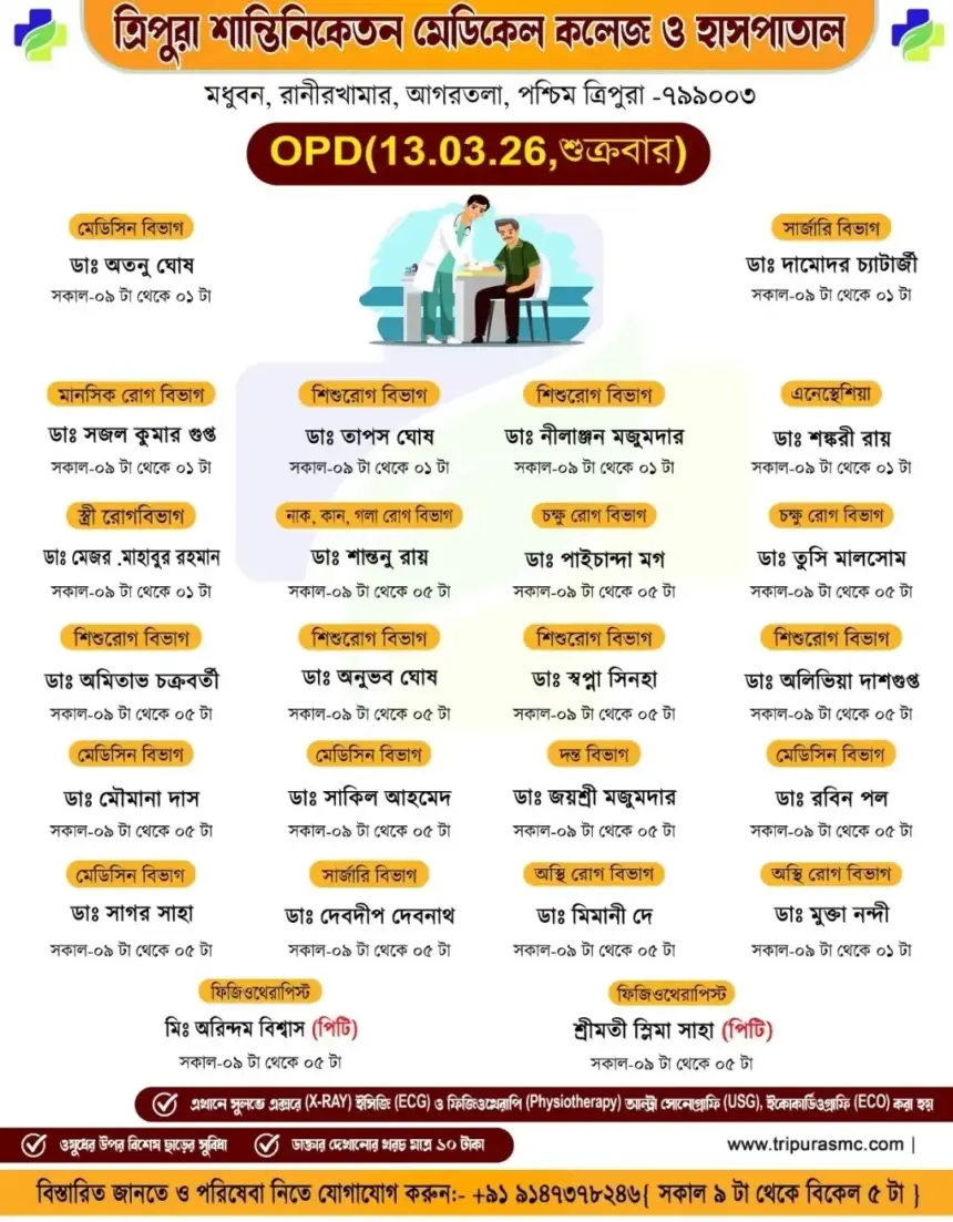 সাধারণ মানুষকে সুলভে সুচিকিৎসা পৌঁছে দিতে প্রতিশ্রুতিবদ্ধ ত্রিপুরা শান্তিনিকেতন মেডিকেল কলেজ ও হাসপাতাল। আগামীকাল অর্থাৎ বুধবার…