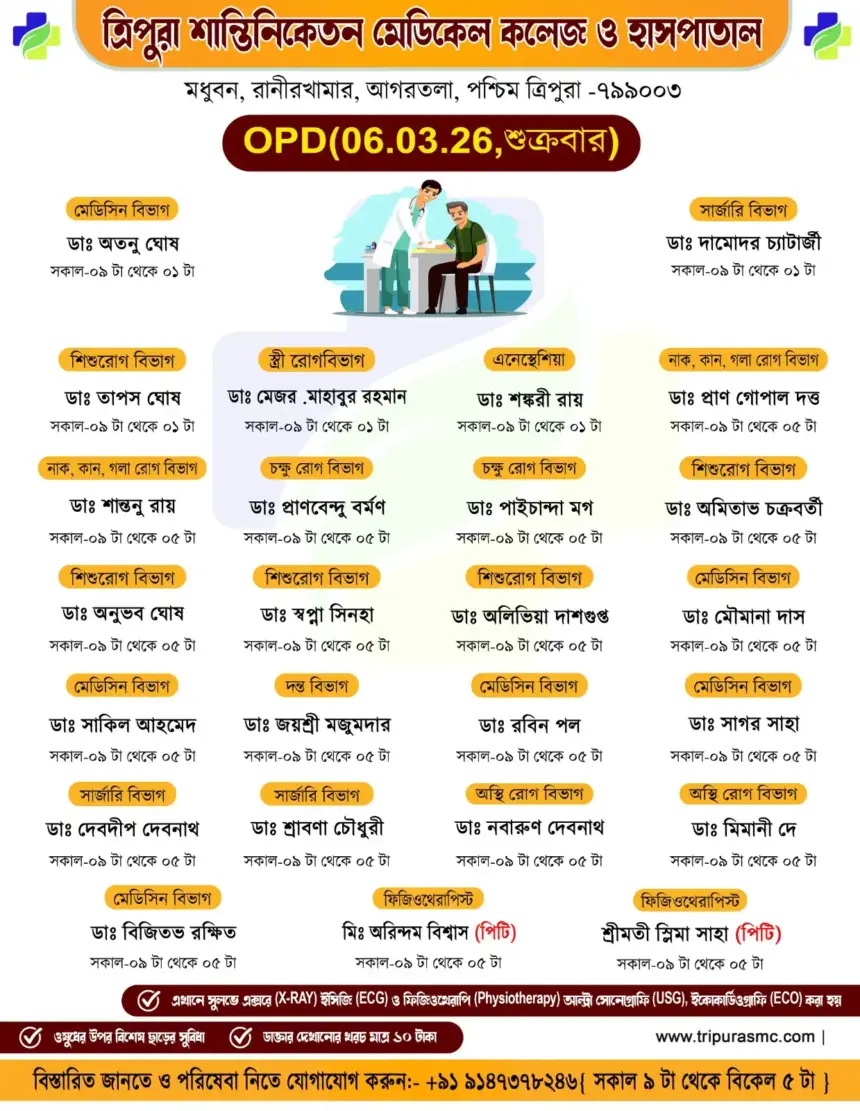 সাধারণ মানুষকে সুলভে সুচিকিৎসা পৌঁছে দিতে প্রতিশ্রুতিবদ্ধ ত্রিপুরা শান্তিনিকেতন মেডিকেল কলেজ ও হাসপাতাল। আগামীকাল অর্থাৎ শুক্রবার…