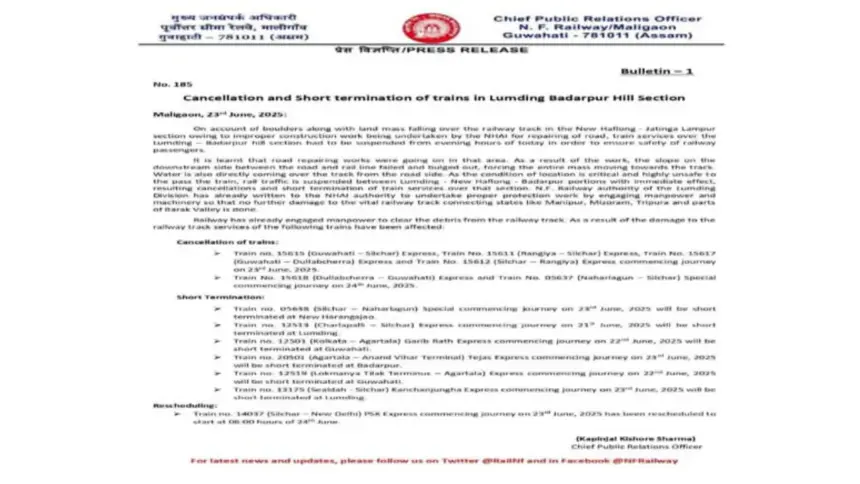 ২৩ জুন বাতিল হওয়া ট্রেনগুলির মধ্যে রয়েছে ট্রেন নং ১৫৬১৫ (গুয়াহাটি-শিলচর) এক্সপ্রেস, ট্রেন নং ১৫৬১১ (রাঙিয়া-শিলচর) এক্সপ্রেস, ট্রেন নং ১৫৬১৭ (গুয়াহাটি-দুল্লাভছড়া) এক্সপ্রেস, ট্রেন নং ১৫৬১২ (শিলচর-রাঙিয়া) এক্সপ্রেস, ট্রেন নং ১৫৬১৮ (দুল্লাভছড়া-গুয়াহাটি) এক্সপ্রেস এবং ২৪ জুনের ট্রেন নং ০৫৬৩৭ (নাহারলাগুন-শিলচর) স্পেশাল। এছাড়া, ২৪ জুন কিছু ট্রেনের যাত্রা মাঝপথে শেষ করা হবে। এর মধ্যে রয়েছে: ট্রেন নং ০৫৬৩৮ (শিলচর-নাহারলাগুন) স্পেশাল ২৩ জুন নিউ হারাঙ্গাজাওয়ে শেষ হবে, ট্রেন নং ১২৫১৩ (চারলাপল্লি-শিলচর) এক্সপ্রেস ২১ জুন লামডিং-এ থামবে, ট্রেন নং ১২৫০১ (কলকাতা-আগরতলা) গরিব রথ এক্সপ্রেস ২২ জুন গুয়াহাটিতে থামবে, ট্রেন নং ২০৫০১ (আগরতলা-আনন্দ বিহার টার্মিনাল) তেজস এক্সপ্রেস ২৩ জুন বদরপুরে থামবে, ট্রেন নং ১২৫১৯ (লোকমান্য তিলক টার্মিনাস-আগরতলা) এক্সপ্রেস ২২ জুন গুয়াহাটিতে থামবে এবং ট্রেন নং ১৩১৭৫ (শিয়ালদহ-শিলচর) কাঞ্চনজঙ্ঘা এক্সপ্রেস ২৩ জুন লামডিং-এ থামবে। এদিকে, ট্রেন নং ১৪০৩৭ (শিলচর-নয়াদিল্লি) পূর্বোত্তর সম্প্রীতি এক্সপ্রেস, যা ২৩ জুন শুরু হওয়ার কথা ছিল, তা এখন ২৪ জুন সকাল ৬টায় শুরু হবে।
