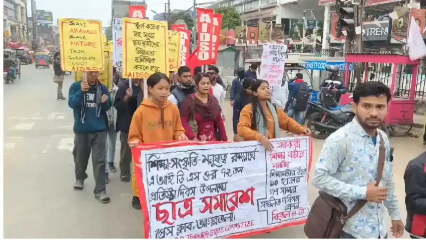 নিউজ ডেস্ক || শিক্ষা, সংস্কৃতি ও মনুষ্যত্ব রক্ষার লক্ষ্যে অল ইন্ডিয়া ডেমোক্র্যাটিক স্টুডেন্টস অর্গানাইজেশন (এআইডিএসও)-র ৭২তম প্রতিষ্ঠা দিবস উপলক্ষ্যে সোমবার আগরতলা প্রেসক্লাবে ছাত্র সমাবেশের আয়োজন করা হয়। এতে ছাত্ররা সরকারী শিক্ষা ব্যবস্থা রক্ষার দাবিতে মিছিল করে এবং ১০ হাজার গণসাক্ষরযুক্ত স্মারকলিপি প্রদান করে।