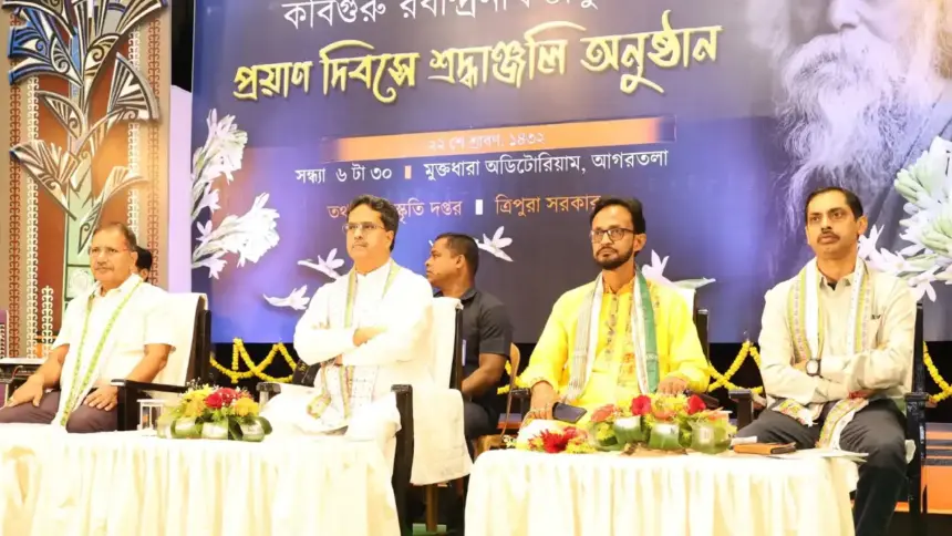 নিউজ ডেস্ক || আজ মুক্তধারা অডিটোরিয়ামে বিশ্বকবি রবীন্দ্রনাথ ঠাকুরের প্রয়াণ দিবস উপলক্ষ্যে তথ্য ও সংস্কৃতি দপ্তরের উদ্যোগে এক শ্রদ্ধাঞ্জলি অনুষ্ঠানের আয়োজন করা হয়। এই অনুষ্ঠানে মুখ্যমন্ত্রী প্রফেসর (ডা.) মানিক সাহা বলেন, রবীন্দ্রনাথ ঠাকুর ভারতীয় কৃষ্টি ও সংস্কৃতির অন্যতম প্রাণপুরুষ। তাঁর চিন্তাধারা ও সাহিত্য আমাদের সমাজের প্রতিটি ক্ষেত্রে গভীরভাবে প্রভাব বিস্তার করেছে। কবিগুরুর সাহিত্য ও দেশপ্রেমের চেতনাকে আগামী প্রজন্মের কাছে আরও বেশি করে তুলে ধরতে হবে। তবেই তাঁকে প্রকৃত শ্রদ্ধা জানানো সম্ভব।