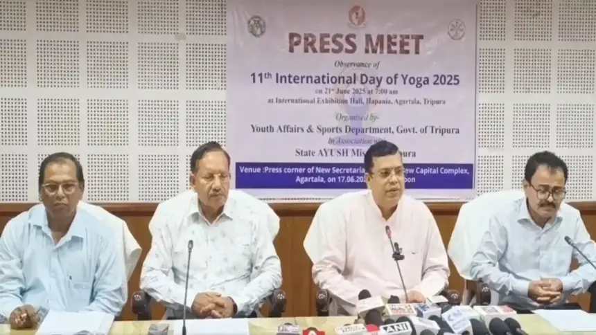 online news tripura > Blog > রাজ্য > ক্রীড়ামন্ত্রীর সাংবাদিক সম্মেলন: আন্তর্জাতিক যোগা দিবস ও সামাজিক সুরক্ষা উদ্যোগের ঘোষণা