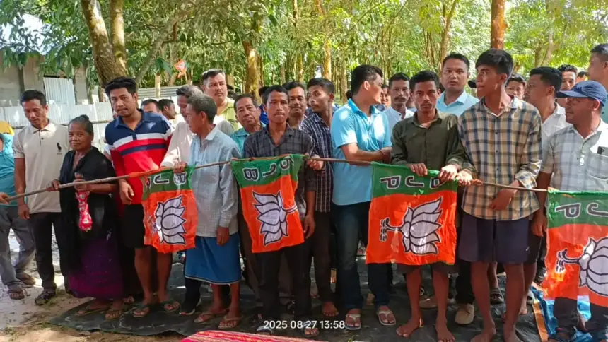নিউজ ডেস্ক || টাকারজলা বিধানসভা কেন্দ্রে বড়সড় রাজনৈতিক ঘটনা! বুধবার দুপুরে টাকারজলা মণ্ডলের অন্তর্গত জন্ম জয়নগর ভিলেজ কমিটির হরিমঙ্গল পাড়ায় মথা দল ত্যাগ করে ভারতীয় জনতা পার্টিতে (বিজেপি) যোগ দিয়েছেন ১৩টি পরিবারের মোট ৫২ জন ভোটার। এই যোগদান সভা টাকারজলা মণ্ডল সভাপতি নির্মল দেববর্মার নেতৃত্বে অনুষ্ঠিত হয়।