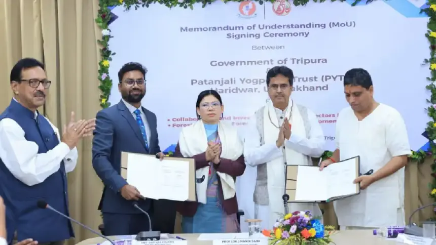 নিউজ ডেস্ক || আজ ত্রিপুরা রাজ্য সরকারের শিল্প ও বাণিজ্য দপ্তর এবং বন দপ্তরের সঙ্গে পতঞ্জলি যোগপীঠ ট্রাস্টের মধ্যে দুটি সমঝোতাপত্র (মউ) স্বাক্ষরিত হয়েছে। মুখ্যমন্ত্রী প্রফেসর (ডা.) মানিক সাহার উপস্থিতিতে এই অনুষ্ঠানে রাজ্যের বিভিন্ন ক্ষেত্রে বিনিয়োগ প্রসার এবং বন ও কৃষি ভিত্তিক ভ্যালু চেইন উন্নয়নের লক্ষ্যে চুক্তি হয়। পতঞ্জলি প্রায় ৪০০ কোটি টাকা বিনিয়োগ করবে বলে জানা গেছে।