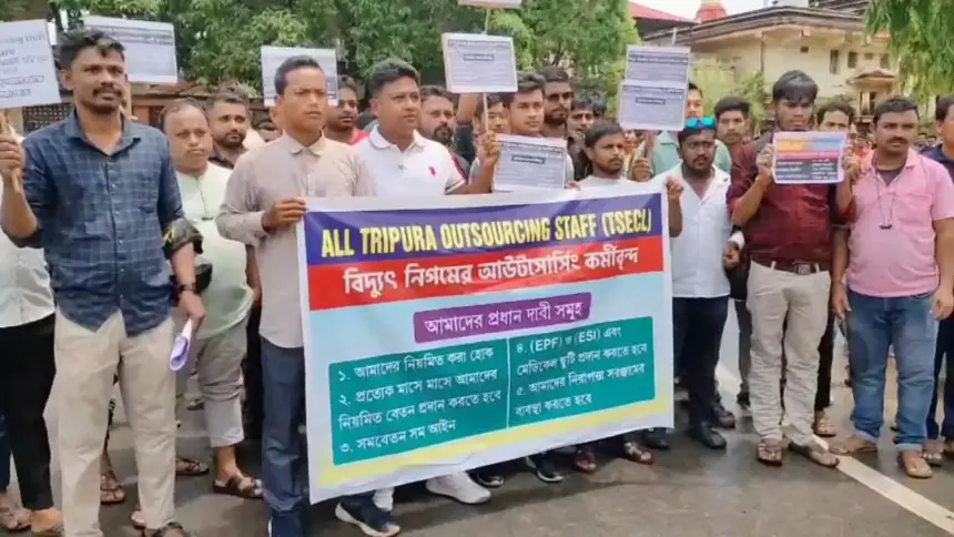 নিউজ ডেস্ক || ত্রিপুরা স্টেট ইলেকট্রিসিটি কর্পোরেশন লিমিটেডের (টিএসইসিএল) আউটসোর্সিং কর্মীরা দীর্ঘদিন ধরে বেতন বৃদ্ধি ও নিয়মিত বেতন প্রদানের দাবিতে আন্দোলনে নেমেছেন। আজ টাউনহলের সামনে থেকে একটি মিছিল করে বিদ্যুৎ দপ্তরের ম্যানেজিং ডিরেক্টরের (এমডি) নিকট পাঁচ দফা দাবি নিয়ে ডেপুটেশন জমা দিয়েছেন তাঁরা।