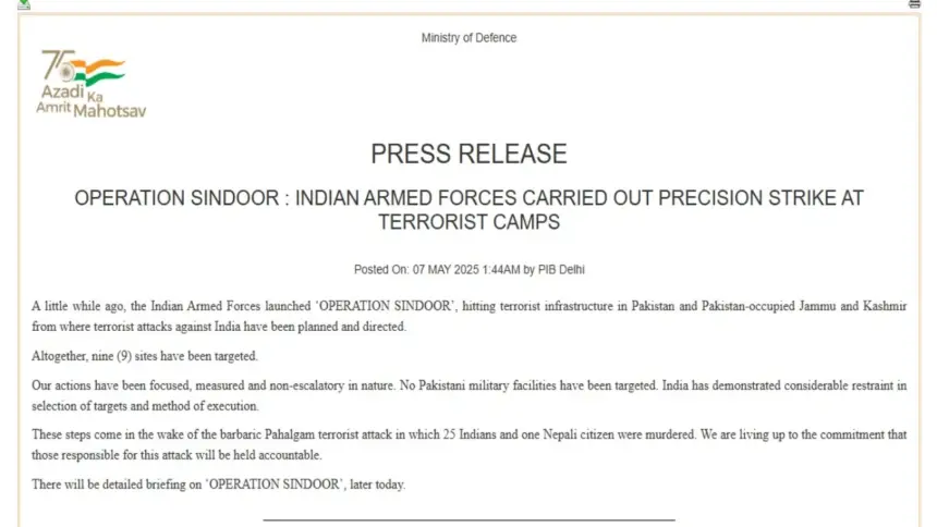 নিউজ ডেস্ক || ভারতীয় সশস্ত্র বাহিনী আজ ভোরে ‘অপারেশন সিন্দুর’ নামে একটি নির্ভুল হামলা চালিয়ে পাকিস্তান ও পাকিস্তান-অধিকৃত জম্মু-কাশ্মীরে অবস্থিত সন্ত্রাসী ঘাঁটিগুলো ধ্বংস করেছে। এই অভিযানে মোট নয়টি সন্ত্রাসী ঘাঁটিকে লক্ষ্য করা হয়েছে, যেখান থেকে ভারতের বিরুদ্ধে সন্ত্রাসী হামলার পরিকল্পনা ও নির্দেশ দেওয়া হচ্ছিল।