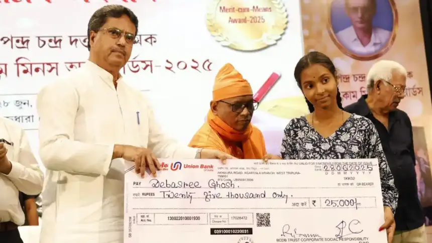 ‘ভূপেন্দ্র চন্দ্র দত্ত ভৌমিক মেরিট কাম মিনস্ অ্যাওয়ার্ড, ২০২৫’ অনুষ্ঠানে মুখ্যমন্ত্রী এ কথা বলেন। তিনি আরও জানান, ভূপেন্দ্র চন্দ্র দত্ত ভৌমিক ট্রাস্ট বর্তমানে সাংবাদিকতার পাশাপাশি সমাজসেবায় উল্লেখযোগ্য ভূমিকা পালন করছে। এই ট্রাস্টের উদ্যোগে শনিবার রাজ্যের ৩৫ জন মেধাবী, আর্থিকভাবে দুর্বল এবং বিশেষভাবে সক্ষম শিক্ষার্থীদের এই মর্যাদাপূর্ণ পুরস্কার প্রদান করা হয়েছে।