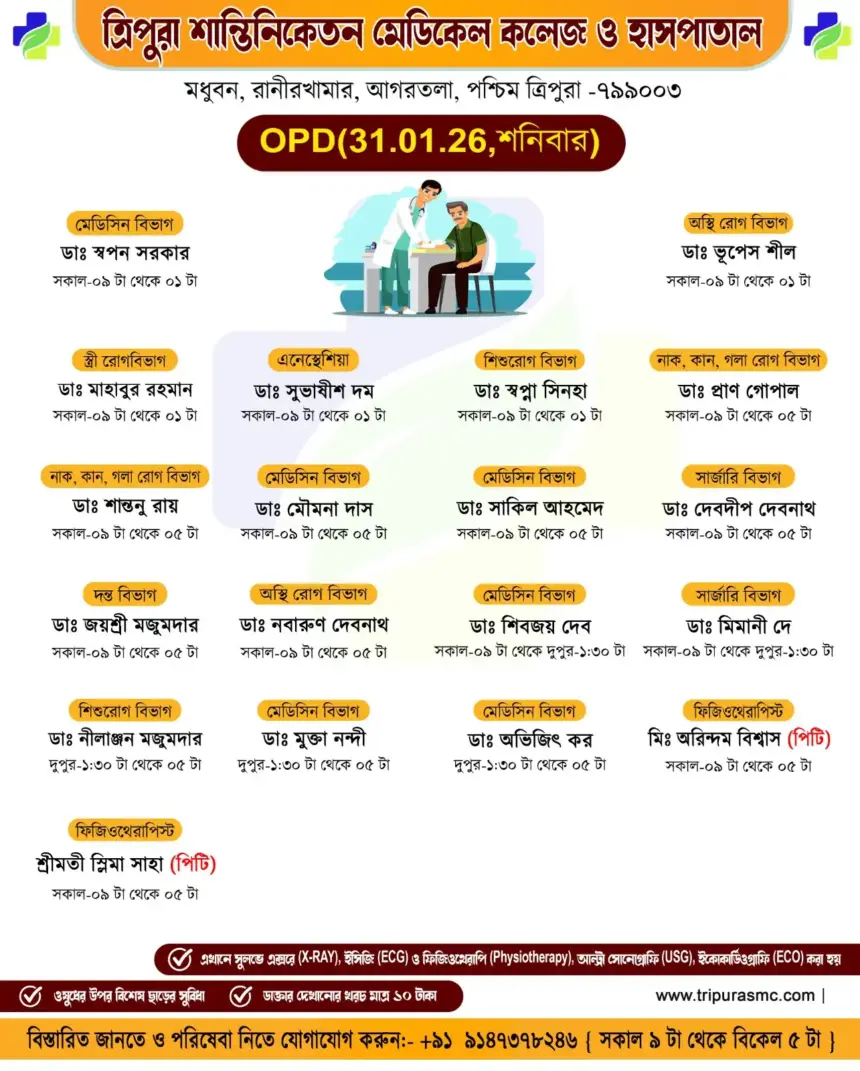 সাধারণ মানুষকে সুলভে সুচিকিৎসা পৌঁছে দিতে প্রতিশ্রুতিবদ্ধ ত্রিপুরা শান্তিনিকেতন মেডিকেল কলেজ ও হাসপাতাল। আগামীকাল অর্থাৎ শনিবার (৩১/০১/২০২৬) ১০টাকার বহির্বিভাগে (OPD) যে সমস্ত অভিজ্ঞ চিকিৎসকেরা পরিষেবা দেবে।