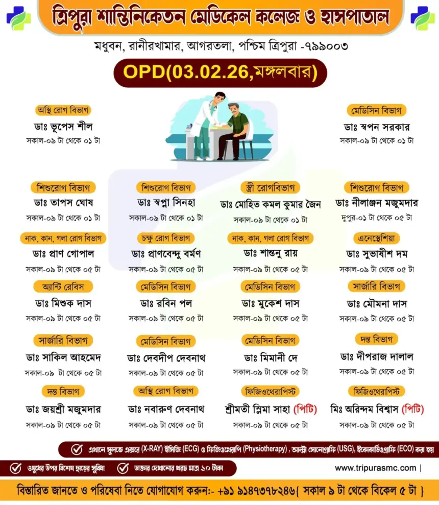 সাধারণ মানুষকে সুলভে সুচিকিৎসা পৌঁছে দিতে প্রতিশ্রুতিবদ্ধ ত্রিপুরা শান্তিনিকেতন মেডিকেল কলেজ ও হাসপাতাল। আগামীকাল অর্থাৎ মঙ্গলবার (০৩/০২/২০২৬) ১০টাকার বহির্বিভাগে (OPD) যে সমস্ত অভিজ্ঞ চিকিৎসকেরা পরিষেবা দেবে।