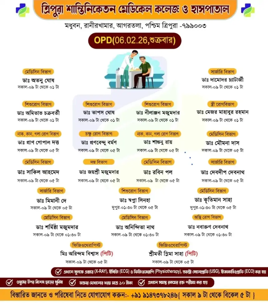 সাধারণ মানুষকে সুলভে সুচিকিৎসা পৌঁছে দিতে প্রতিশ্রুতিবদ্ধ ত্রিপুরা শান্তিনিকেতন মেডিকেল কলেজ ও হাসপাতাল। আগামীকাল অর্থাৎ শুক্রবার (০৬/০২/২০২৬) ১০টাকার বহির্বিভাগে (OPD) যে সমস্ত অভিজ্ঞ চিকিৎসকেরা পরিষেবা দেবে।