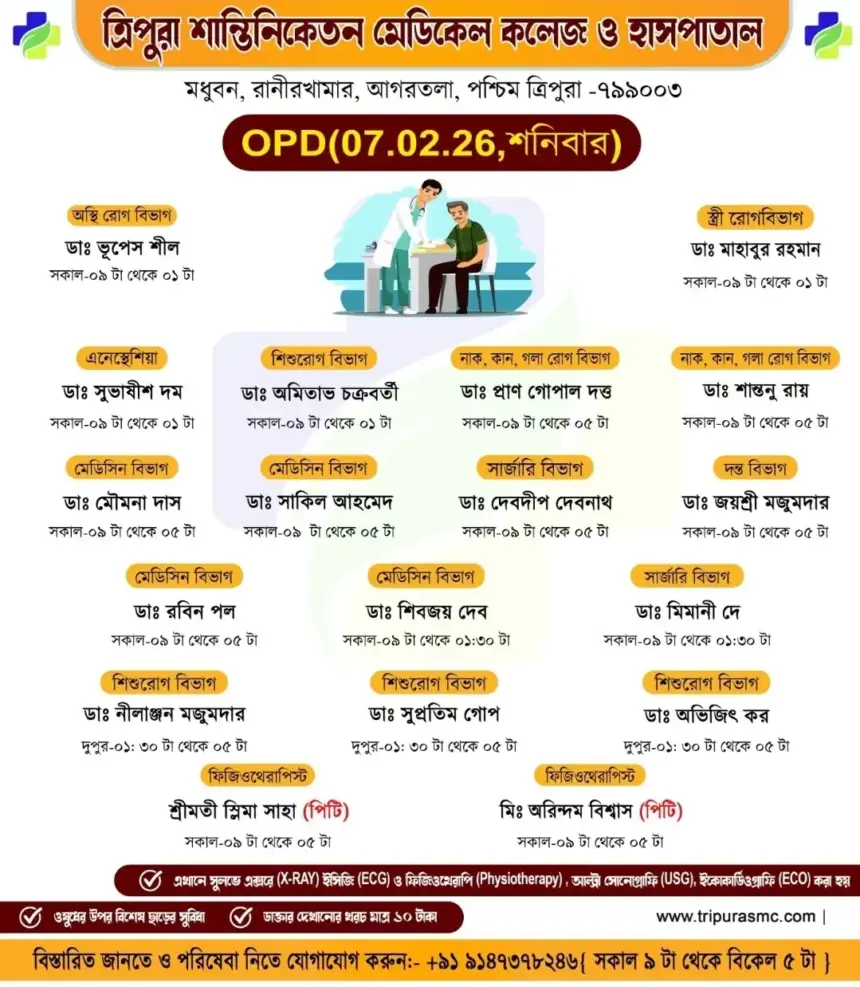 সাধারণ মানুষকে সুলভে সুচিকিৎসা পৌঁছে দিতে প্রতিশ্রুতিবদ্ধ ত্রিপুরা শান্তিনিকেতন মেডিকেল কলেজ ও হাসপাতাল। আগামীকাল অর্থাৎ শনিবার (০৭/০২/২০২৬) ১০টাকার বহির্বিভাগে (OPD) যে সমস্ত অভিজ্ঞ চিকিৎসকেরা পরিষেবা দেবে।