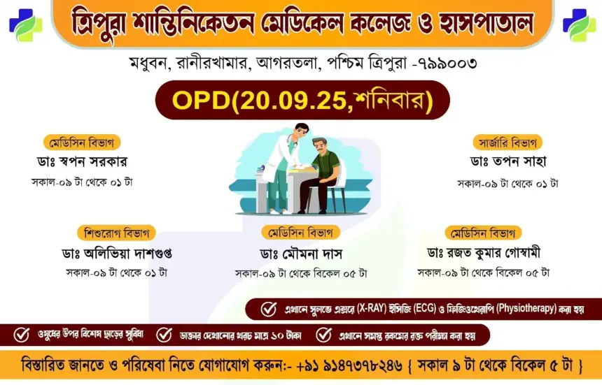 সাধারণ মানুষকে সুলভে সুচিকিৎসা পৌঁছে দিতে প্রতিশ্রুতিবদ্ধ ত্রিপুরা শান্তিনিকেতন মেডিকেল কলেজ ও হাসপাতাল। আগামীকাল ১০টাকার বহির্বিভাগে (OPD) যে সমস্ত অভিজ্ঞ চিকিৎসকেরা পরিষেবা দেবেন: