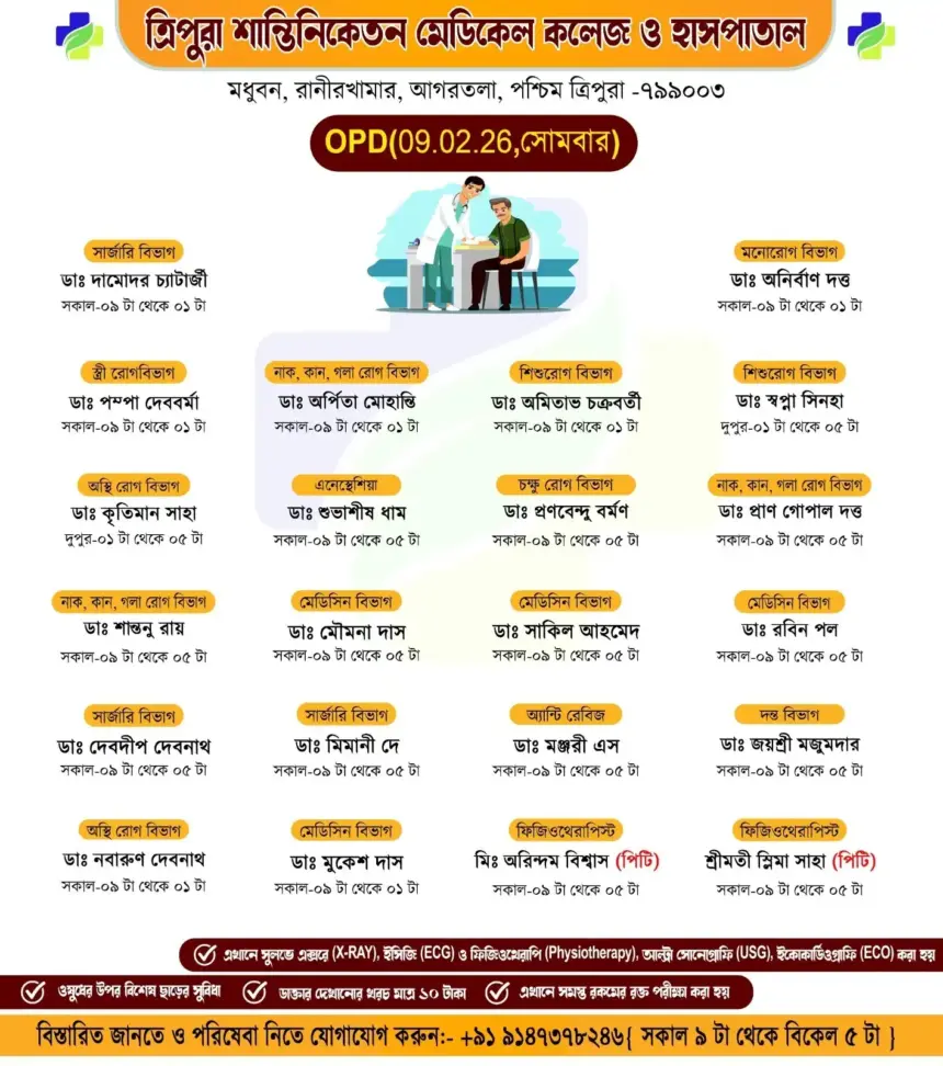 সাধারণ মানুষকে সুলভে সুচিকিৎসা পৌঁছে দিতে প্রতিশ্রুতিবদ্ধ ত্রিপুরা শান্তিনিকেতন মেডিকেল কলেজ ও হাসপাতাল। আগামীকাল অর্থাৎ সোমবার (০৯/০২/২০২৬) ১০টাকার বহির্বিভাগে (OPD) যে সমস্ত অভিজ্ঞ চিকিৎসকেরা পরিষেবা দেবে।