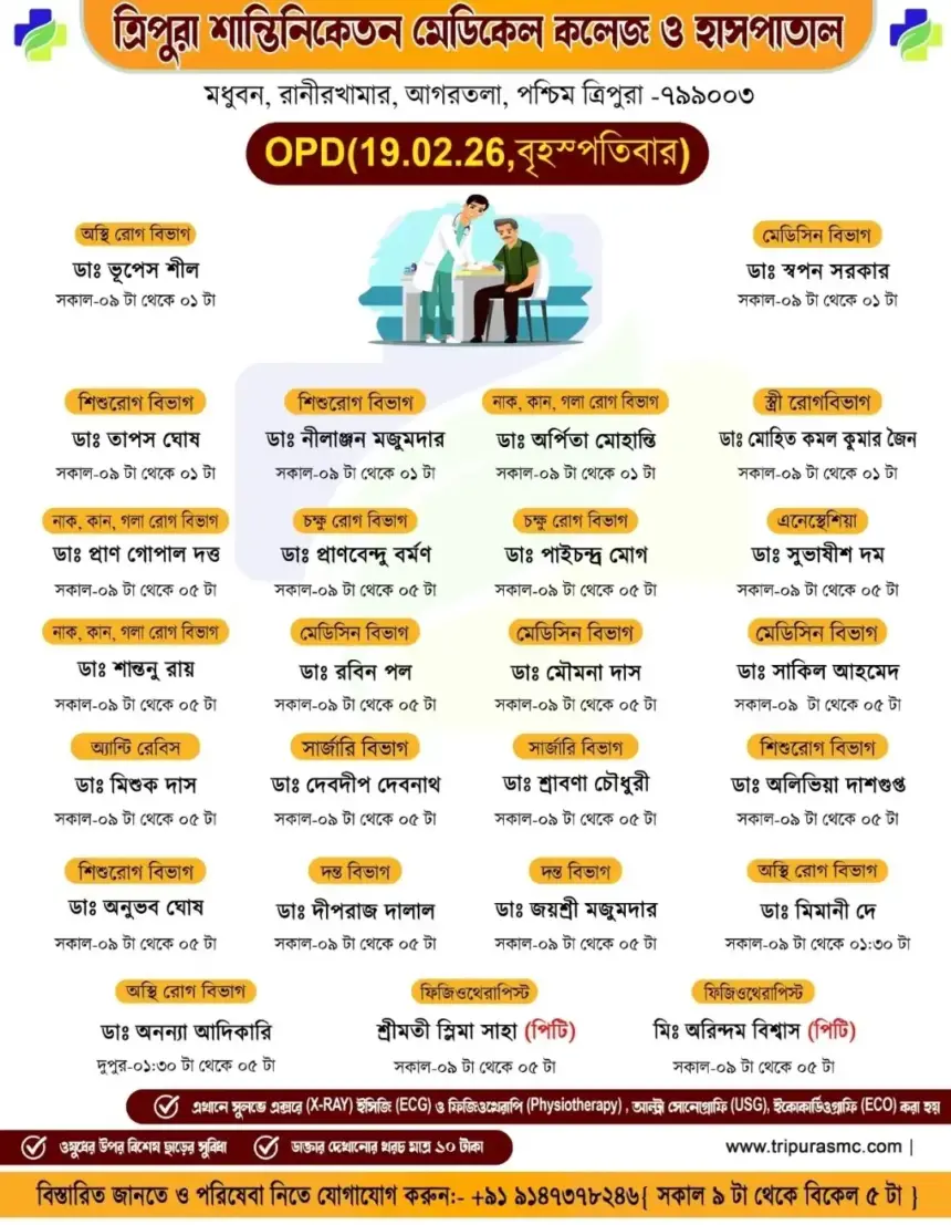 সাধারণ মানুষকে সুলভে সুচিকিৎসা পৌঁছে দিতে প্রতিশ্রুতিবদ্ধ ত্রিপুরা শান্তিনিকেতন মেডিকেল কলেজ ও হাসপাতাল। আগামীকাল অর্থাৎ বৃহস্পতিবার (১৯/০২/২০২৬) ১০টাকার বহির্বিভাগে (OPD) যে সমস্ত অভিজ্ঞ চিকিৎসকেরা পরিষেবা দেবে।