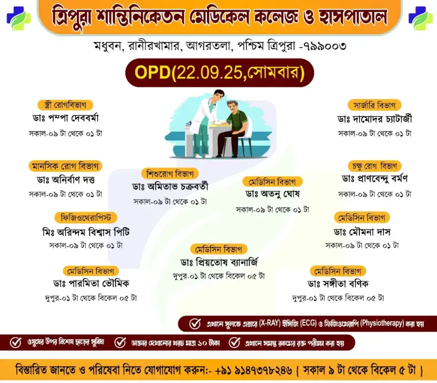 সাধারণ মানুষকে সুলভে সুচিকিৎসা পৌঁছে দিতে প্রতিশ্রুতিবদ্ধ ত্রিপুরা শান্তিনিকেতন মেডিকেল কলেজ ও হাসপাতাল। আগামীকাল ১০টাকার বহির্বিভাগে (OPD) যে সমস্ত অভিজ্ঞ চিকিৎসকেরা পরিষেবা দেবেন: