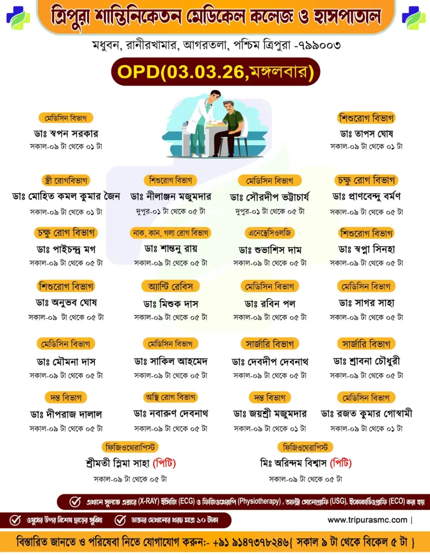 সাধারণ মানুষকে সুলভে সুচিকিৎসা পৌঁছে দিতে প্রতিশ্রুতিবদ্ধ ত্রিপুরা শান্তিনিকেতন মেডিকেল কলেজ ও হাসপাতাল। আগামীকাল অর্থাৎ মঙ্গলবার (০৩/০৩/২০২৬) ১০টাকার বহির্বিভাগে (OPD) যে সমস্ত অভিজ্ঞ চিকিৎসকেরা পরিষেবা দেবে।
