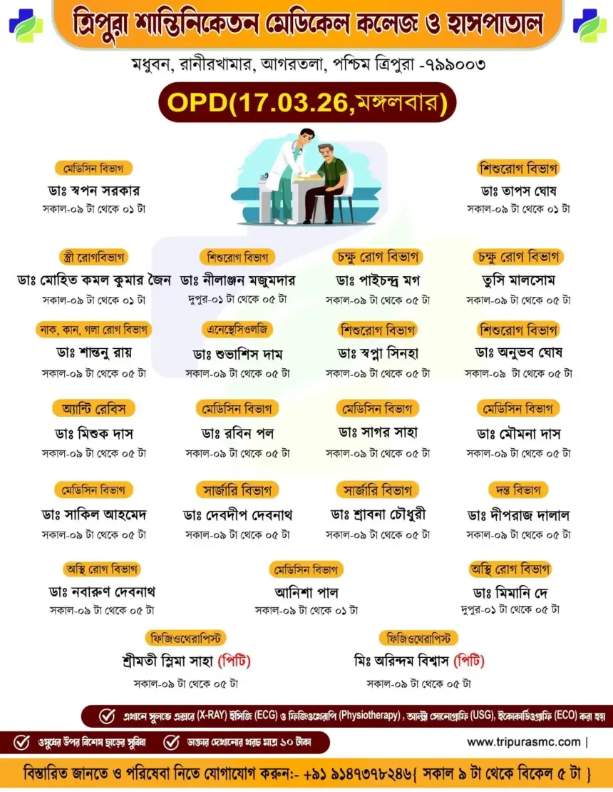 সাধারণ মানুষকে সুলভে সুচিকিৎসা পৌঁছে দিতে প্রতিশ্রুতিবদ্ধ ত্রিপুরা শান্তিনিকেতন মেডিকেল কলেজ ও হাসপাতাল। আগামীকাল অর্থাৎ মঙ্গলবার (১৭/০৩/২০২৬) ১০টাকার বহির্বিভাগে (OPD) যে সমস্ত অভিজ্ঞ চিকিৎসকেরা পরিষেবা দেবে।