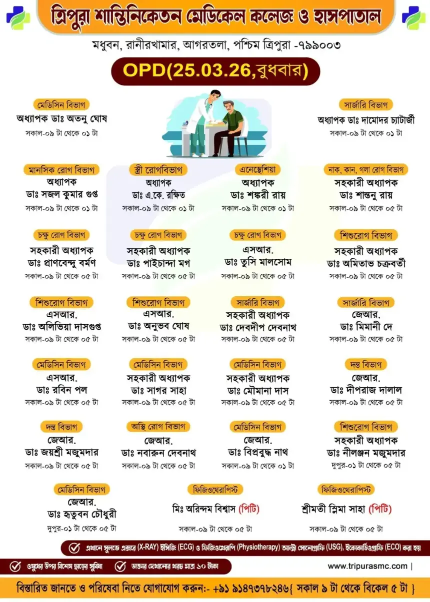 সাধারণ মানুষকে সুলভে সুচিকিৎসা পৌঁছে দিতে প্রতিশ্রুতিবদ্ধ ত্রিপুরা শান্তিনিকেতন মেডিকেল কলেজ ও হাসপাতাল। 📅 আগামীকাল অর্থাৎ বুধবার (২৫/০৩/২০২৬) বহির্বিভাগে (OPD) 🩺 মাত্র ১০ টাকার ভিজিটিং ফিতে যে সমস্ত অভিজ্ঞ ও দক্ষ চিকিৎসকেরা পরিষেবা দেবে। ✨ আপনার সুস্থতাই আমাদের অঙ্গীকার