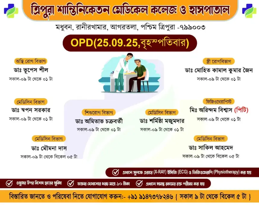 সাধারণ মানুষকে সুলভে সুচিকিৎসা পৌঁছে দিতে প্রতিশ্রুতিবদ্ধ ত্রিপুরা শান্তিনিকেতন মেডিকেল কলেজ ও হাসপাতাল। আগামীকাল ১০টাকার বহির্বিভাগে (OPD) যে সমস্ত অভিজ্ঞ চিকিৎসকেরা পরিষেবা দেবেন:
