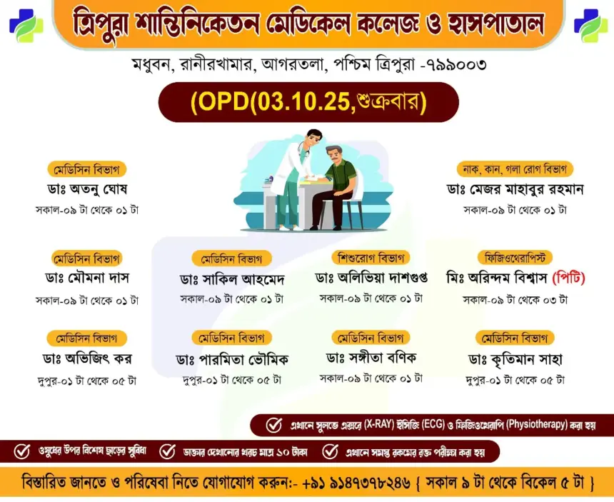 সাধারণ মানুষকে সুলভে সুচিকিৎসা পৌঁছে দিতে প্রতিশ্রুতিবদ্ধ ত্রিপুরা শান্তিনিকেতন মেডিকেল কলেজ ও হাসপাতাল। আগামীকাল ১০টাকার বহির্বিভাগে (OPD) যে সমস্ত অভিজ্ঞ চিকিৎসকেরা পরিষেবা দেবেন :