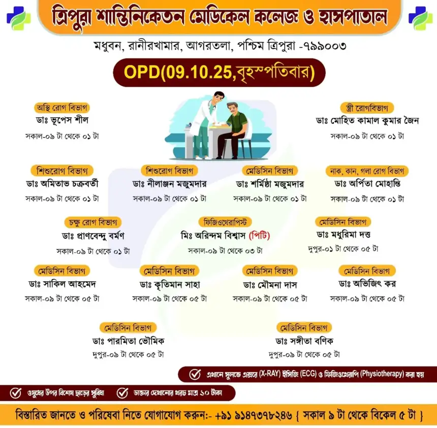 সাধারণ মানুষকে সুলভে সুচিকিৎসা পৌঁছে দিতে প্রতিশ্রুতিবদ্ধ ত্রিপুরা শান্তিনিকেতন মেডিকেল কলেজ ও হাসপাতাল। আগামীকাল ১০টাকার বহির্বিভাগে (OPD) যে সমস্ত অভিজ্ঞ চিকিৎসকেরা পরিষেবা দেবেন :