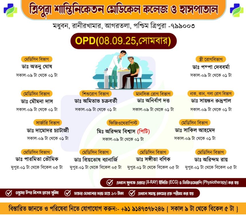 সাধারণ মানুষকে সুলভে সুচিকিৎসা পৌঁছে দিতে প্রতিশ্রুতিবদ্ধ ত্রিপুরা শান্তিনিকেতন মেডিকেল কলেজ ও হাসপাতাল। আগামীকাল ১০টাকার বহির্বিভাগে (OPD) যে সমস্ত অভিজ্ঞ চিকিৎসকেরা পরিষেবা দেবেন: