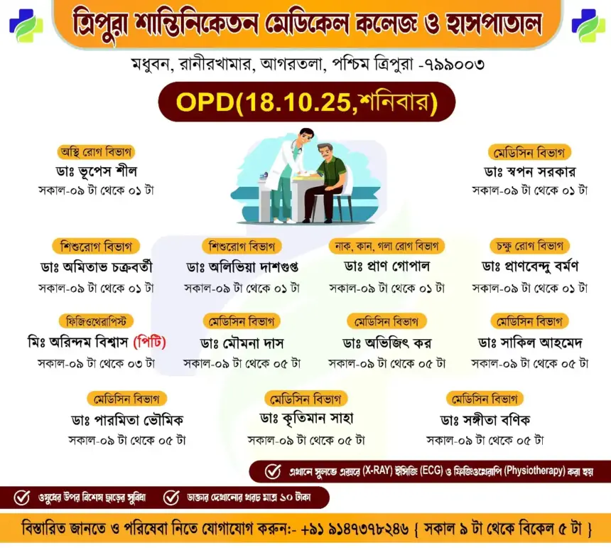 সাধারণ মানুষকে সুলভে সুচিকিৎসা পৌঁছে দিতে প্রতিশ্রুতিবদ্ধ ত্রিপুরা শান্তিনিকেতন মেডিকেল কলেজ ও হাসপাতাল। আগামীকাল ১০টাকার বহির্বিভাগে (OPD) যে সমস্ত অভিজ্ঞ চিকিৎসকেরা পরিষেবা দেবে