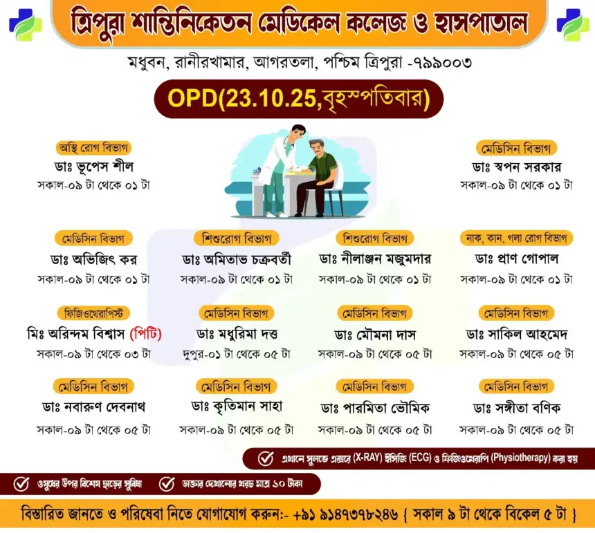 সাধারণ মানুষকে সুলভে সুচিকিৎসা পৌঁছে দিতে প্রতিশ্রুতিবদ্ধ ত্রিপুরা শান্তিনিকেতন মেডিকেল কলেজ ও হাসপাতাল। আগামীকাল ১০টাকার বহির্বিভাগে (OPD) যে সমস্ত অভিজ্ঞ চিকিৎসকেরা পরিষেবা দেবে