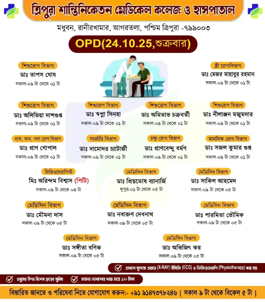 সাধারণ মানুষকে সুলভে সুচিকিৎসা পৌঁছে দিতে প্রতিশ্রুতিবদ্ধ ত্রিপুরা শান্তিনিকেতন মেডিকেল কলেজ ও হাসপাতাল। আগামীকাল ১০টাকার বহির্বিভাগে (OPD) যে সমস্ত অভিজ্ঞ চিকিৎসকেরা পরিষেবা দেবে