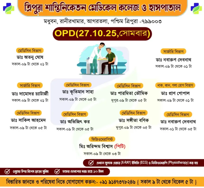 সাধারণ মানুষকে সুলভে সুচিকিৎসা পৌঁছে দিতে প্রতিশ্রুতিবদ্ধ ত্রিপুরা শান্তিনিকেতন মেডিকেল কলেজ ও হাসপাতাল। আগামীকাল ১০টাকার বহির্বিভাগে (OPD) যে সমস্ত অভিজ্ঞ চিকিৎসকেরা পরিষেবা দেবে।