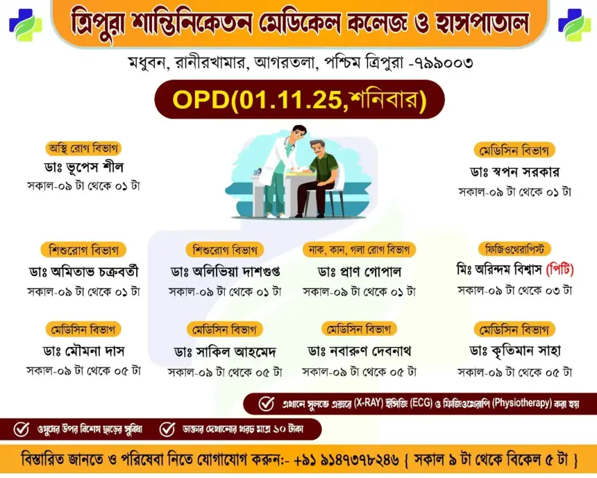 সাধারণ মানুষকে সুলভে সুচিকিৎসা পৌঁছে দিতে প্রতিশ্রুতিবদ্ধ ত্রিপুরা শান্তিনিকেতন মেডিকেল কলেজ ও হাসপাতাল। আগামীকাল ১০টাকার বহির্বিভাগে (OPD) যে সমস্ত অভিজ্ঞ চিকিৎসকেরা পরিষেবা দেবে।