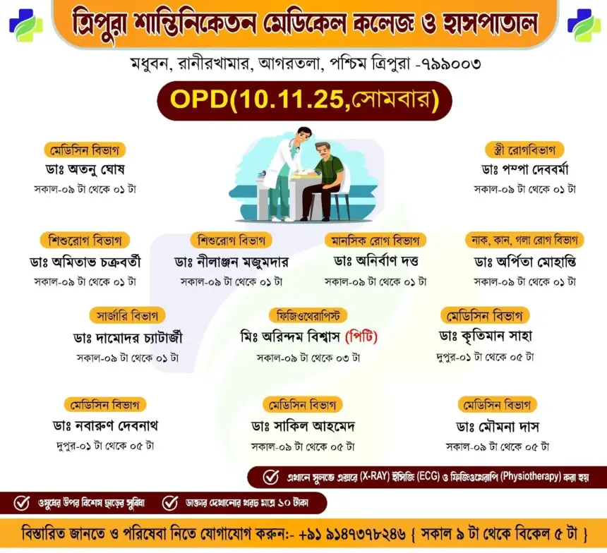 সাধারণ মানুষকে সুলভে সুচিকিৎসা পৌঁছে দিতে প্রতিশ্রুতিবদ্ধ ত্রিপুরা শান্তিনিকেতন মেডিকেল কলেজ ও হাসপাতাল। আগামীকাল অর্থাৎ সোমবার (10/১১/২০২৫) ১০টাকার বহির্বিভাগে (OPD) যে সমস্ত অভিজ্ঞ চিকিৎসকেরা পরিষেবা দেবে।