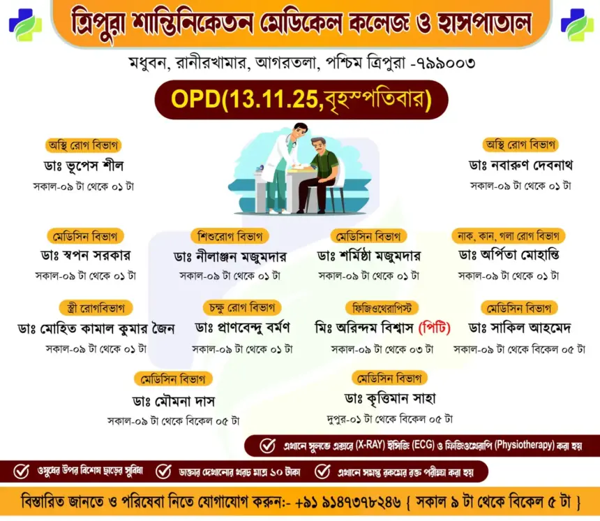 সাধারণ মানুষকে সুলভে সুচিকিৎসা পৌঁছে দিতে প্রতিশ্রুতিবদ্ধ ত্রিপুরা শান্তিনিকেতন মেডিকেল কলেজ ও হাসপাতাল। আগামীকাল অর্থাৎ বৃহস্পতিবার (১3/১১/২০২৫) ১০টাকার বহির্বিভাগে (OPD) যে সমস্ত অভিজ্ঞ চিকিৎসকেরা পরিষেবা দেবে।