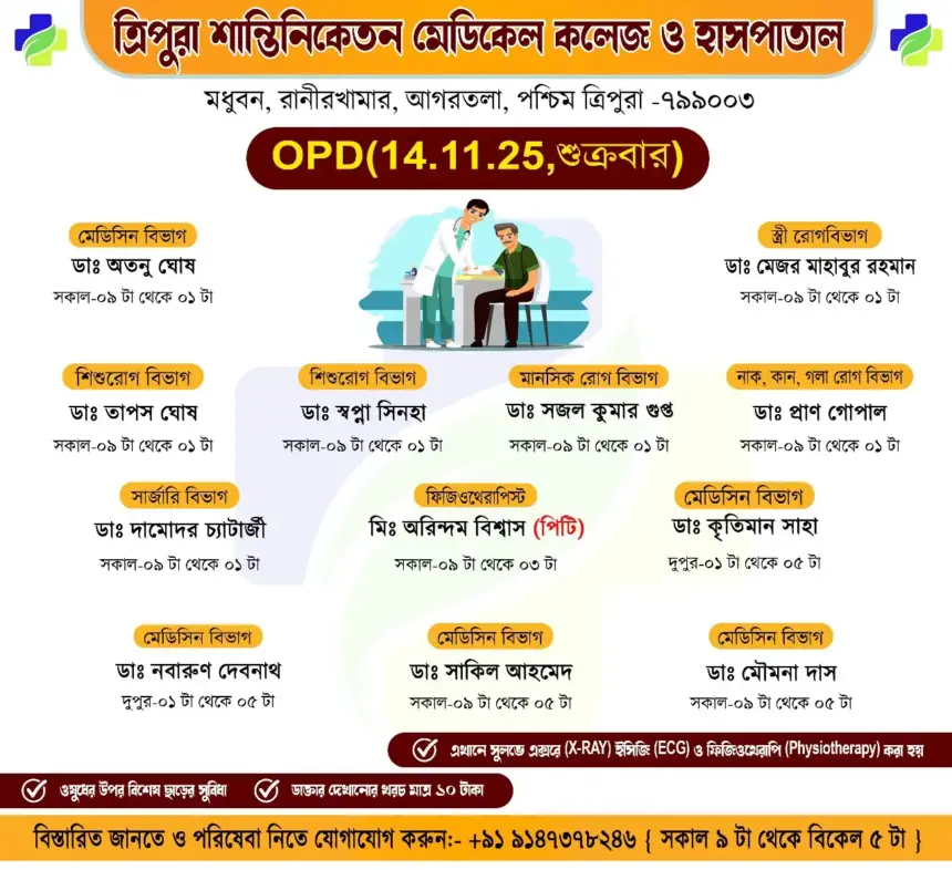 সাধারণ মানুষকে সুলভে সুচিকিৎসা পৌঁছে দিতে প্রতিশ্রুতিবদ্ধ ত্রিপুরা শান্তিনিকেতন মেডিকেল কলেজ ও হাসপাতাল। আগামীকাল অর্থাৎ শুক্রবার (১৪/১১/২০২৫) ১০টাকার বহির্বিভাগে (OPD) যে সমস্ত অভিজ্ঞ চিকিৎসকেরা পরিষেবা দেবে