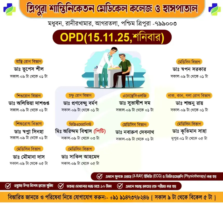 সাধারণ মানুষকে সুলভে সুচিকিৎসা পৌঁছে দিতে প্রতিশ্রুতিবদ্ধ ত্রিপুরা শান্তিনিকেতন মেডিকেল কলেজ ও হাসপাতাল। আগামীকাল অর্থাৎ শনিবার (১৫/১১/২০২৫) ১০টাকার বহির্বিভাগে (OPD) যে সমস্ত অভিজ্ঞ চিকিৎসকেরা পরিষেবা দেবে।