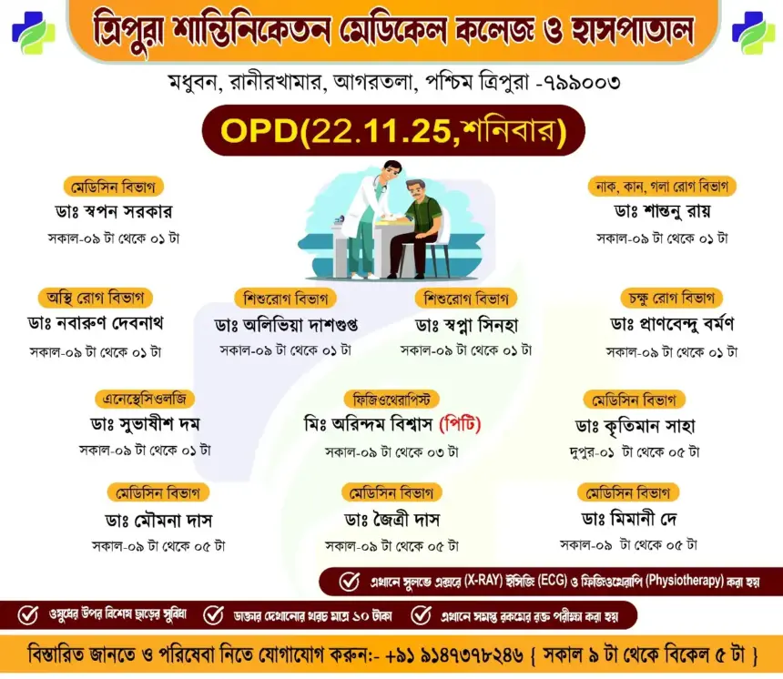 সাধারণ মানুষকে সুলভে সুচিকিৎসা পৌঁছে দিতে প্রতিশ্রুতিবদ্ধ ত্রিপুরা শান্তিনিকেতন মেডিকেল কলেজ ও হাসপাতাল। আগামীকাল অর্থাৎ শনিবার (২২/১১/২০২৫) ১০টাকার বহির্বিভাগে (OPD) যে সমস্ত অভিজ্ঞ চিকিৎসকেরা পরিষেবা দেবে।