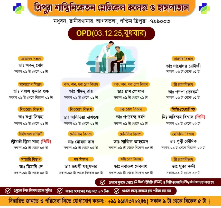 সাধারণ মানুষকে সুলভে সুচিকিৎসা পৌঁছে দিতে প্রতিশ্রুতিবদ্ধ ত্রিপুরা শান্তিনিকেতন মেডিকেল কলেজ ও হাসপাতাল। আগামীকাল অর্থাৎ বুধবার (০৩/১২/২০২৫) ১০টাকার বহির্বিভাগে (OPD) যে সমস্ত অভিজ্ঞ চিকিৎসকেরা পরিষেবা দেবে।