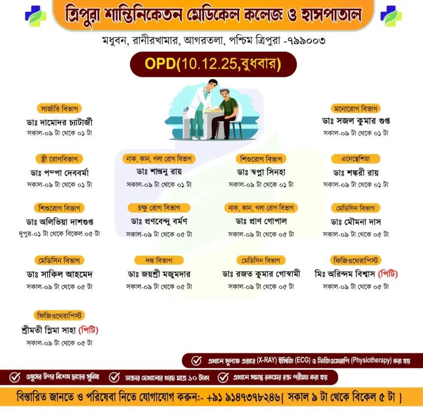 সাধারণ মানুষকে সুলভে সুচিকিৎসা পৌঁছে দিতে প্রতিশ্রুতিবদ্ধ ত্রিপুরা শান্তিনিকেতন মেডিকেল কলেজ ও হাসপাতাল। আগামীকাল অর্থাৎ বুধবার (১০/১২/২০২৫) ১০টাকার বহির্বিভাগে (OPD) যে সমস্ত অভিজ্ঞ চিকিৎসকেরা পরিষেবা দেবে।