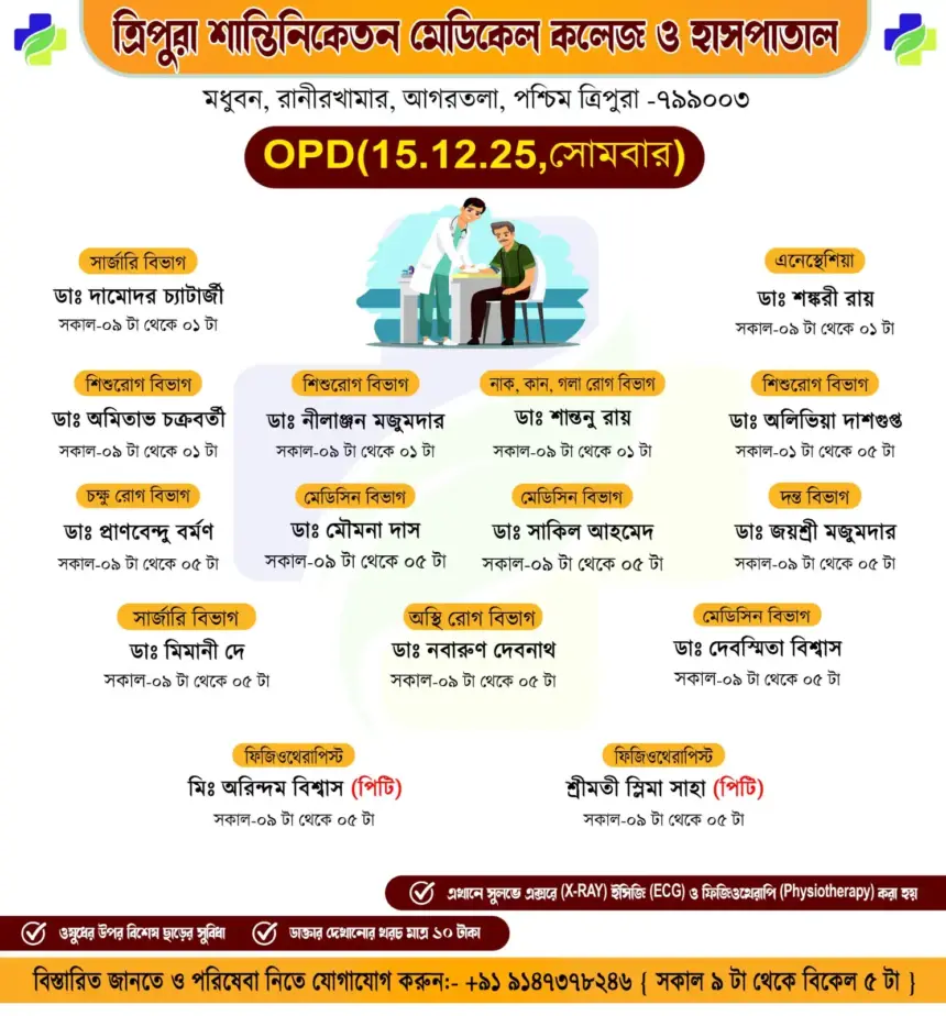 সাধারণ মানুষকে সুলভে সুচিকিৎসা পৌঁছে দিতে প্রতিশ্রুতিবদ্ধ ত্রিপুরা শান্তিনিকেতন মেডিকেল কলেজ ও হাসপাতাল। আগামীকাল অর্থাৎ সোমবার (১৫/১২/২০২৫) ১০টাকার বহির্বিভাগে (OPD) যে সমস্ত অভিজ্ঞ চিকিৎসকেরা পরিষেবা দেবে।