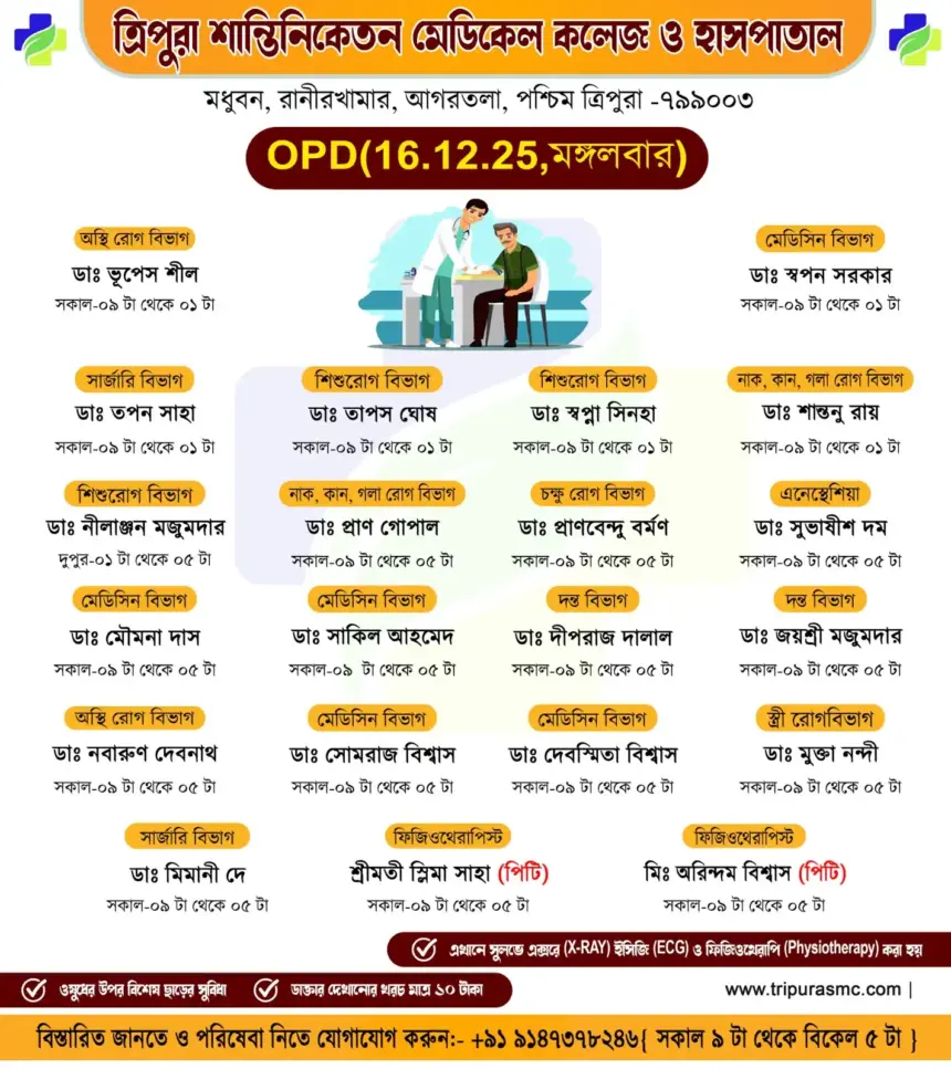 সাধারণ মানুষকে সুলভে সুচিকিৎসা পৌঁছে দিতে প্রতিশ্রুতিবদ্ধ ত্রিপুরা শান্তিনিকেতন মেডিকেল কলেজ ও হাসপাতাল। আগামীকাল অর্থাৎ মঙ্গলবার (১৬/১২/২০২৫) ১০টাকার বহির্বিভাগে (OPD) যে সমস্ত অভিজ্ঞ চিকিৎসকেরা পরিষেবা দেবে।