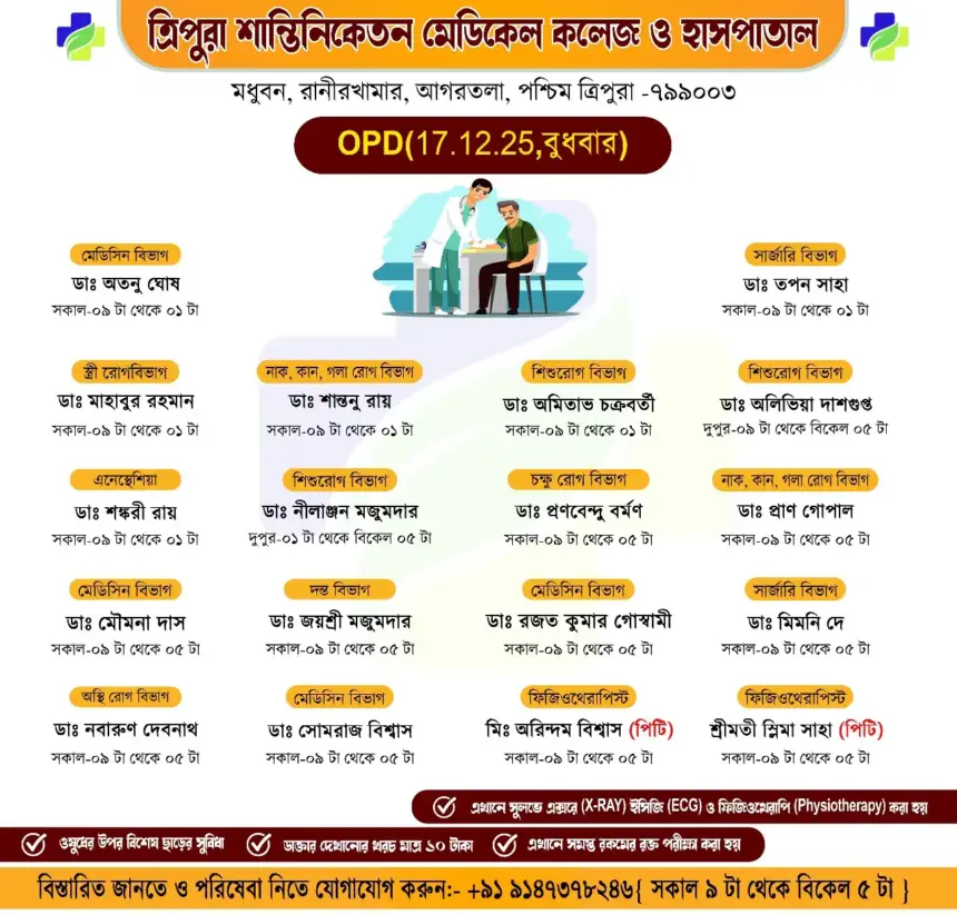 সাধারণ মানুষকে সুলভে সুচিকিৎসা পৌঁছে দিতে প্রতিশ্রুতিবদ্ধ ত্রিপুরা শান্তিনিকেতন মেডিকেল কলেজ ও হাসপাতাল। আগামীকাল অর্থাৎ বুধবার (১৭/১২/২০২৫) ১০টাকার বহির্বিভাগে (OPD) যে সমস্ত অভিজ্ঞ চিকিৎসকেরা পরিষেবা দেবে।