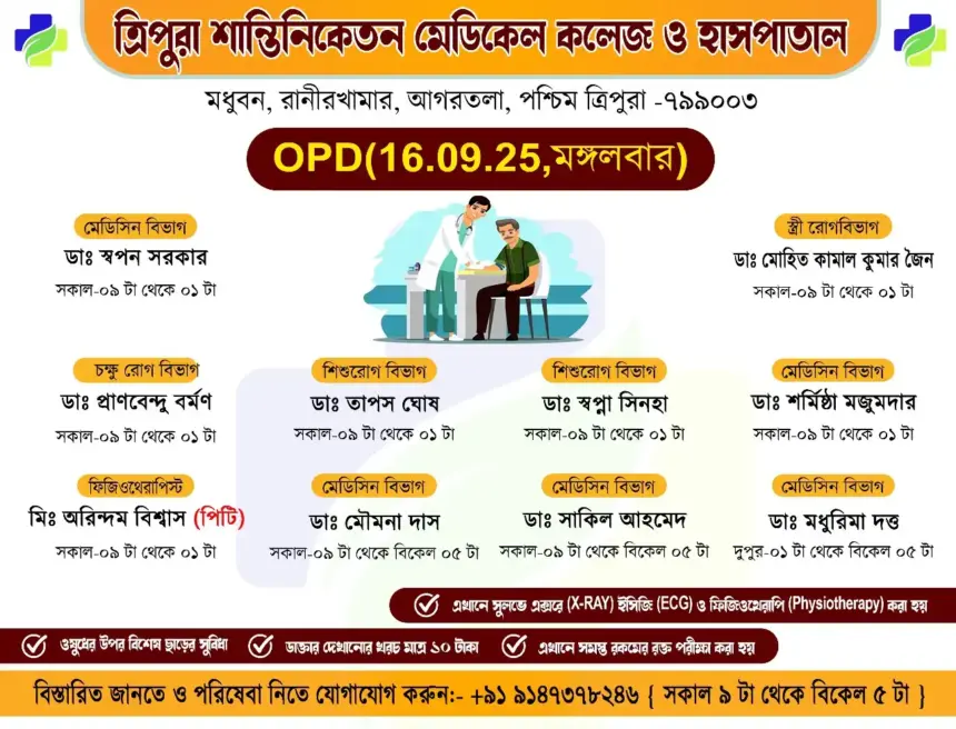 সাধারণ মানুষকে সুলভে সুচিকিৎসা পৌঁছে দিতে প্রতিশ্রুতিবদ্ধ ত্রিপুরা শান্তিনিকেতন মেডিকেল কলেজ ও হাসপাতাল। আগামীকাল ১০টাকার বহির্বিভাগে (OPD) যে সমস্ত অভিজ্ঞ চিকিৎসকেরা পরিষেবা দেবেন: