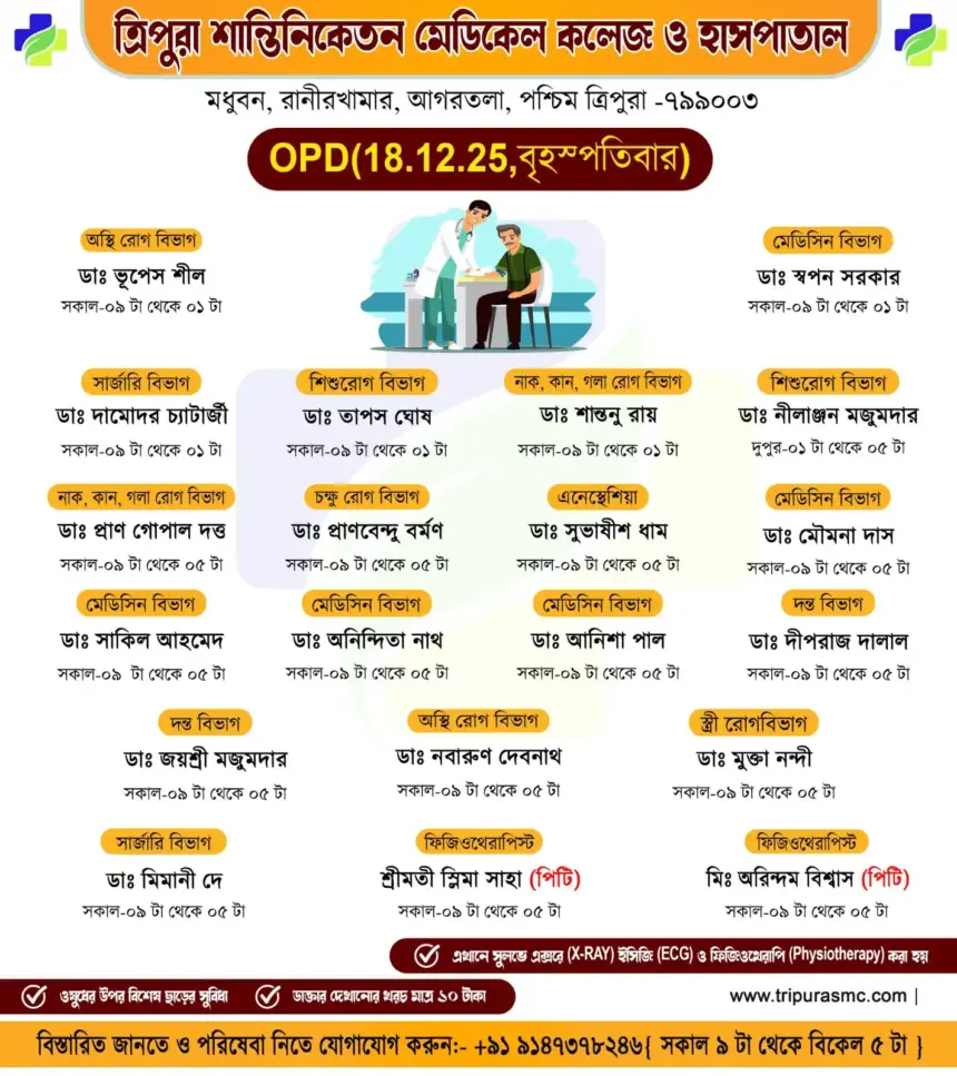 online news tripura > Blog > রাজ্য > সাধারণ মানুষকে সুলভে সুচিকিৎসা পৌঁছে দিতে প্রতিশ্রুতিবদ্ধ ত্রিপুরা শান্তিনিকেতন মেডিকেল কলেজ ও হাসপাতাল। আগামীকাল অর্থাৎ বৃহস্পতিবার (১৮/১২/২০২৫) ১০টাকার বহির্বিভাগে (OPD) যে সমস্ত অভিজ্ঞ চিকিৎসকেরা পরিষেবা দেবে।