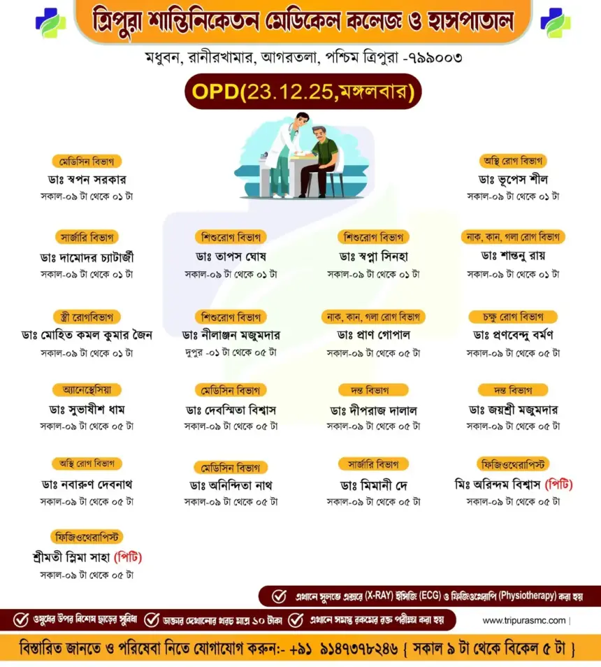online news tripura > Blog > রাজ্য > সাধারণ মানুষকে সুলভে সুচিকিৎসা পৌঁছে দিতে প্রতিশ্রুতিবদ্ধ ত্রিপুরা শান্তিনিকেতন মেডিকেল কলেজ ও হাসপাতাল। আগামীকাল অর্থাৎ মঙ্গলবার (২৩/১২/২০২৫) ১০টাকার বহির্বিভাগে (OPD) যে সমস্ত অভিজ্ঞ চিকিৎসকেরা পরিষেবা দেবে।