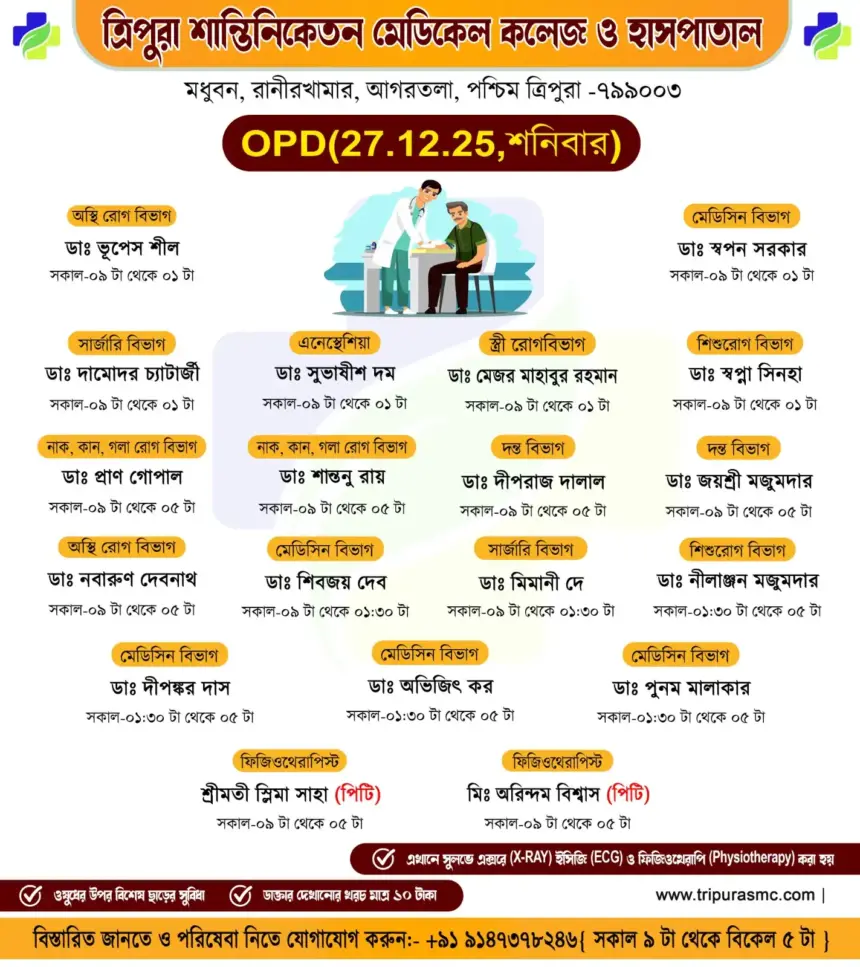 সাধারণ মানুষকে সুলভে সুচিকিৎসা পৌঁছে দিতে প্রতিশ্রুতিবদ্ধ ত্রিপুরা শান্তিনিকেতন মেডিকেল কলেজ ও হাসপাতাল। আগামীকাল অর্থাৎ শনিবার (২৭/১২/২০২৫) ১০টাকার বহির্বিভাগে (OPD) যে সমস্ত অভিজ্ঞ চিকিৎসকেরা পরিষেবা দেবে।