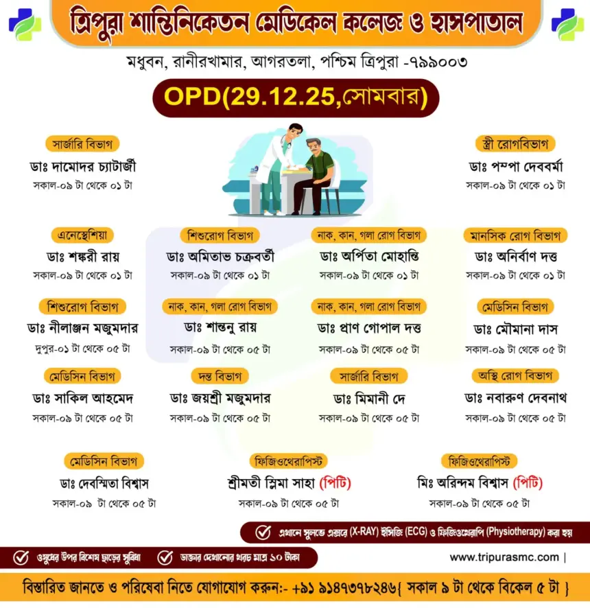 Reading: সাধারণ মানুষকে সুলভে সুচিকিৎসা পৌঁছে দিতে প্রতিশ্রুতিবদ্ধ ত্রিপুরা শান্তিনিকেতন মেডিকেল কলেজ ও হাসপাতাল। আগামীকাল অর্থাৎ সোমবার (২৯/১২/২০২৫) ১০টাকার বহির্বিভাগে (OPD) যে সমস্ত অভিজ্ঞ চিকিৎসকেরা পরিষেবা দেবে।