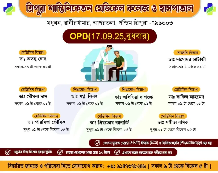 সাধারণ মানুষকে সুলভে সুচিকিৎসা পৌঁছে দিতে প্রতিশ্রুতিবদ্ধ ত্রিপুরা শান্তিনিকেতন মেডিকেল কলেজ ও হাসপাতাল। আগামীকাল ১০টাকার বহির্বিভাগে (OPD) যে সমস্ত অভিজ্ঞ চিকিৎসকেরা পরিষেবা দেবেন:
