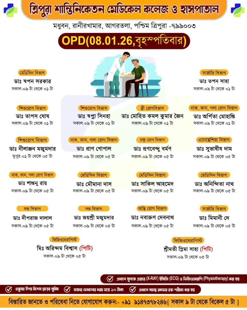 সাধারণ মানুষকে সুলভে সুচিকিৎসা পৌঁছে দিতে প্রতিশ্রুতিবদ্ধ ত্রিপুরা শান্তিনিকেতন মেডিকেল কলেজ ও হাসপাতাল। আগামীকাল অর্থাৎ বৃহস্পতিবার (০৮/০১/২০২৬) ১০টাকার বহির্বিভাগে (OPD) যে সমস্ত অভিজ্ঞ চিকিৎসকেরা পরিষেবা দেবে।