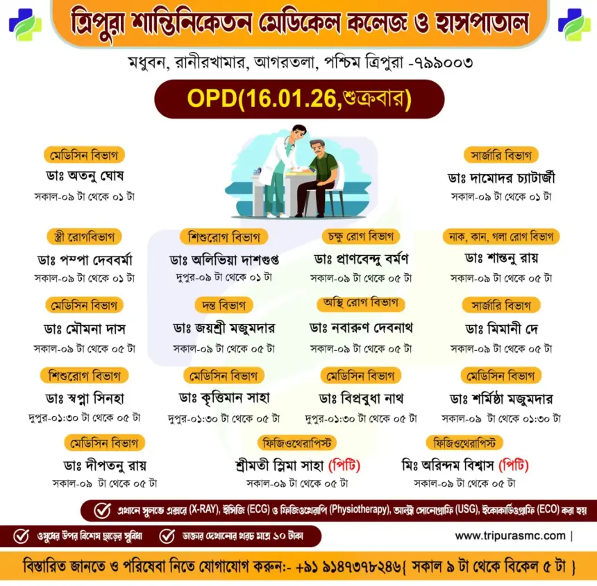 সাধারণ মানুষকে সুলভে সুচিকিৎসা পৌঁছে দিতে প্রতিশ্রুতিবদ্ধ ত্রিপুরা শান্তিনিকেতন মেডিকেল কলেজ ও হাসপাতাল। আগামীকাল অর্থাৎ বৃহস্পতিবার (১৬/০১/২০২৬) ১০টাকার বহির্বিভাগে (OPD) যে সমস্ত অভিজ্ঞ চিকিৎসকেরা পরিষেবা দেবে।