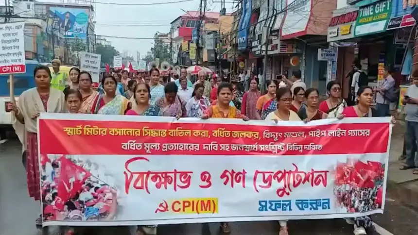 নিউজ ডেস্ক || স্মার্ট মিটার, বিদ্যুৎ মাশুল এবং জলের বর্ধিত কর প্রত্যাহারের দাবিতে উত্তাল হল ত্রিপুরার রাজধানী আগরতলা। শনিবার সিপিআইএমের উদ্যোগে মেলার মাঠে দলীয় কার্যালয় থেকে একটি বিক্ষোভ মিছিল বের হয়। মিছিলটি শহরের বিভিন্ন পথ পরিক্রমা করে ওরিয়েন্ট চৌমুহনীতে গিয়ে একটি সভায় মিলিত হয়। এই মিছিলে নেতৃত্ব দেন প্রাক্তন বিদ্যুৎ মন্ত্রী তথা সিআইটিইউ রাজ্য সভাপতি মানিক দে, সদর জেলা সম্পাদক অমল চক্রবর্তী সহ অন্যান্য নেতৃবৃন্দ।